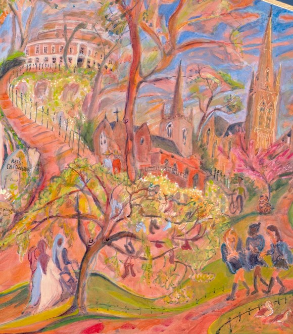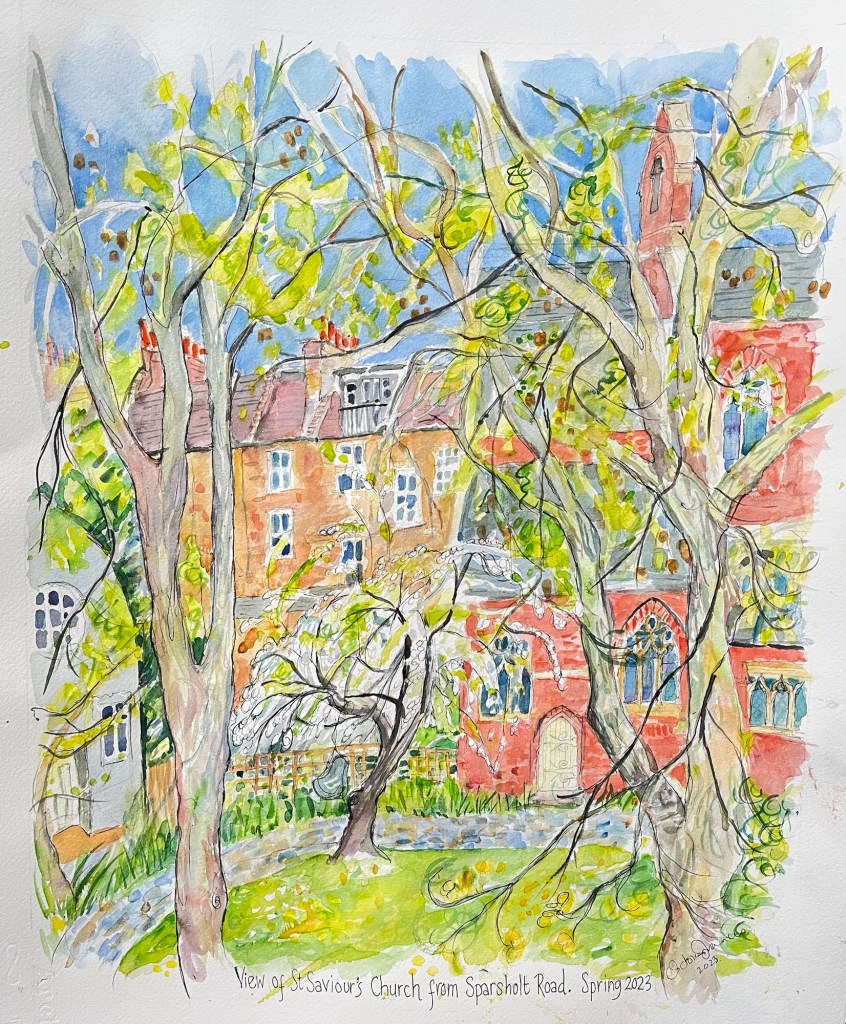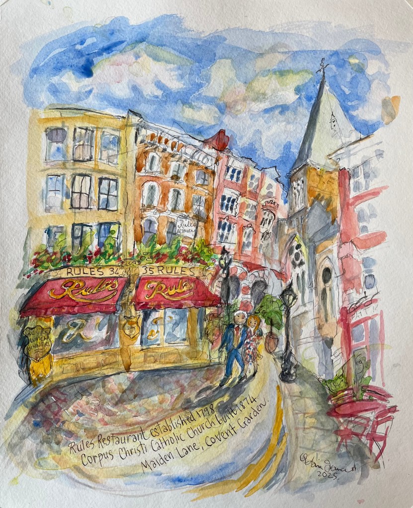 Detail: Stories in the lid of a harpsichord. Acrylic on poplar wood. 2024Stories in the lid of a harpsichord. Acrylic on poplar wood. 2024. Commissioned by Ruth WhiteheadMaiden Lane, Covent Garden. Watercolour. Private Commission 2025The Barn at Elmore. Watercolour and ink. 2023. Private commissionSpring view from a North London window. 2024. Private commission